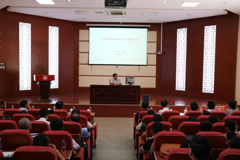 9月10日上午,省委網信辦副主任葉得盛應邀來我校作題為《關于新形勢下網絡輿情引導與管控》的專題輔導報告。校黨委副書記肖慶偉,校黨委常委、副校長何紹福出席講座,漳州市委網信辦副主任張東洲及有關人員,我校各二級學院黨委書記、副書記,機關教輔單位負責人,民主黨派、無黨派和統戰團體負責人,輔導員等近200人參加講座,講座由肖慶偉主持。
