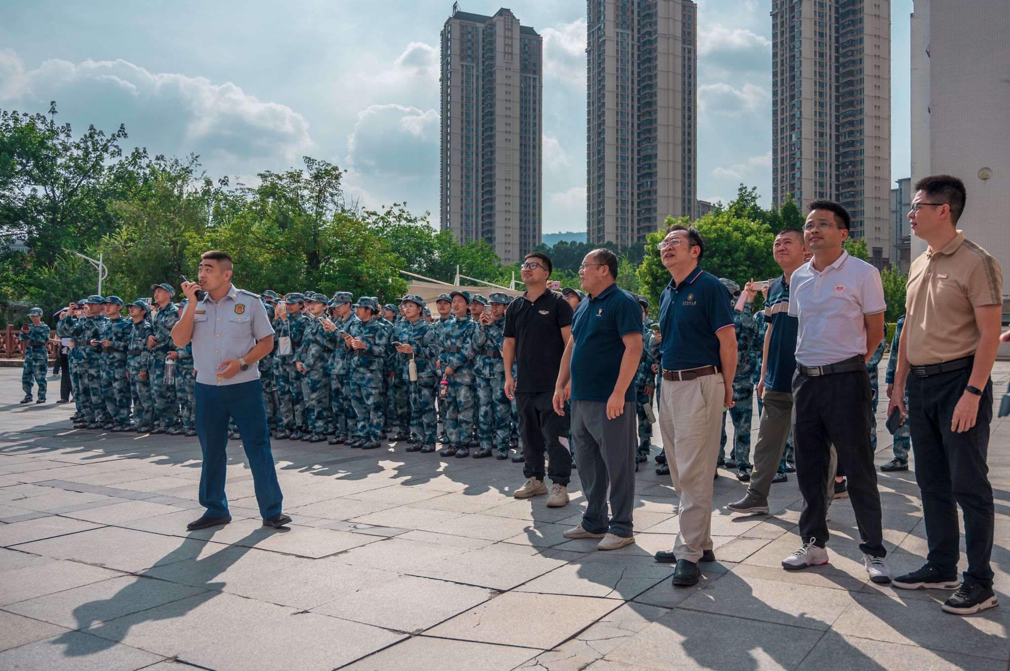 本次演練模擬達理學生公寓某宿舍突發火情,火勢迅速蔓延。火情發生后,第一時間拉響警報,學生們用濕毛巾捂住口鼻,按照各樓棟應急疏散通道路線彎腰前行,緊急疏散至安全地帶集合。消防救援官兵迅速在安保人員的引導下趕赴現場,搜救受傷人員;火場外,高空水槍噴射出強勁水流,迅速撲向火源,在消防人員的奮力撲救下,火勢最終得到控制。