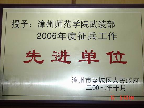 2007年10月10日,在薌城區(qū)2007年征兵工作會議上,我院人民武裝部被薌城區(qū)人民政府授予“2006年度征兵工作先進(jìn)單位”(漳薌政文〔2007〕184號)。