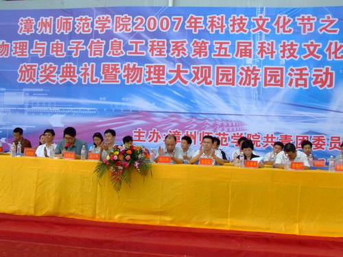 5月27日下午4:00,物理與電子信息工程系第五屆科技文化節頒獎典禮暨“物理大觀園”游園活動在達理公寓學生管理中心隆重舉行。院保衛處處長莊小平、院團委副書記朱百里,物電系黨政領導、各兄弟系團委代表,漳州一中、漳州三中等中學校長,漳州無線電協會、漳州科華電子、漳州科能電子、萬利達優科電子等企業負責人應邀出席頒獎典禮,并參加“物理大觀園”游園活動。