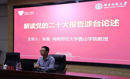 閩南師范大學圓山學院教授、商務部海貿會理事朱磊為與會人員作題為《解讀黨的二十大報告涉臺論述》的報告。朱磊教授詳細解讀了黨的二十大報告中涉臺內容的論述,深入闡明了黨的二十大報告對臺工作論述的創新之處和豐富內涵,從過去、現在和未來三個層面全面系統地闡釋了中央對臺工作總體方略和實踐要求。他認為,黨的二十大報告對臺工作論述的主基調是爭取和平統一,同時保持反分裂、反干涉“雙反”斗爭的戰略手段,反對外部勢力干涉是今后一個時期對臺工作的突出任務。他強調,國家統一、民族復興的歷史車輪滾滾向前,祖國完全統一一定要實現,也一定能夠實現。朱磊教授的報告內容豐富、內涵深刻,兼具理論性和創新性,對與會人員深入學習貫徹黨的二十大報告對臺論述精神具有重要的指導意義。