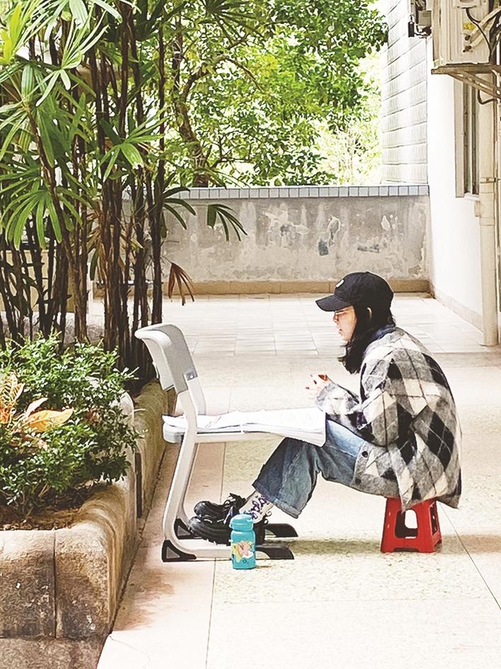 教室外、走廊上,同學正在輕聲默背。