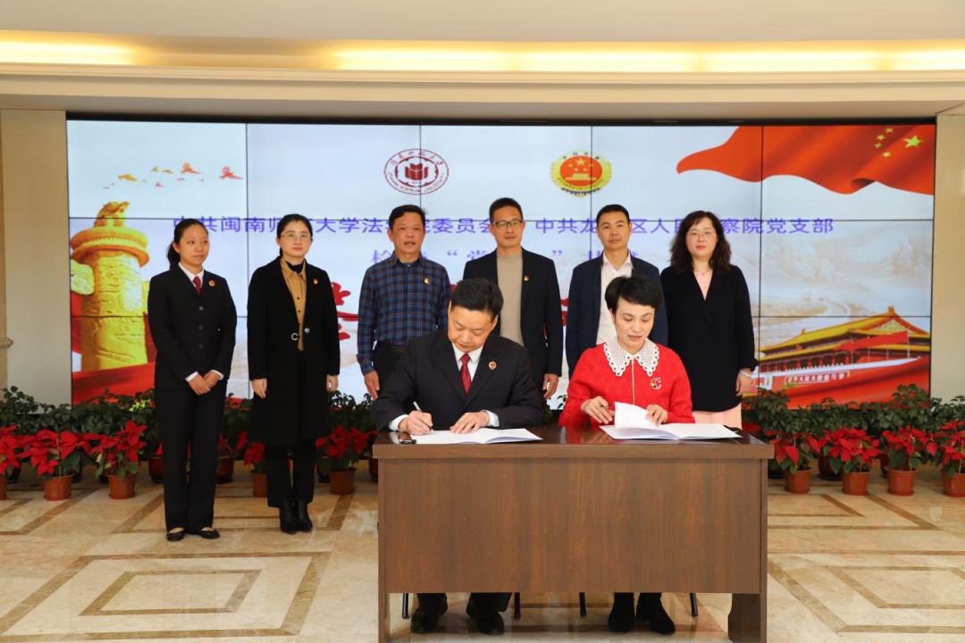 ▲閩南師范大學(xué)法學(xué)院黨委主持工作副書記陳越與龍文檢察院黨組書記、張文鋒檢察長(zhǎng)簽約