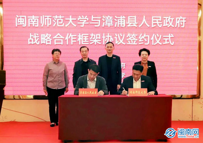 閩南師范大學社會合作處處長陳志宏、漳浦縣副縣長連少鵬代表校地雙方簽署戰略合作協議書