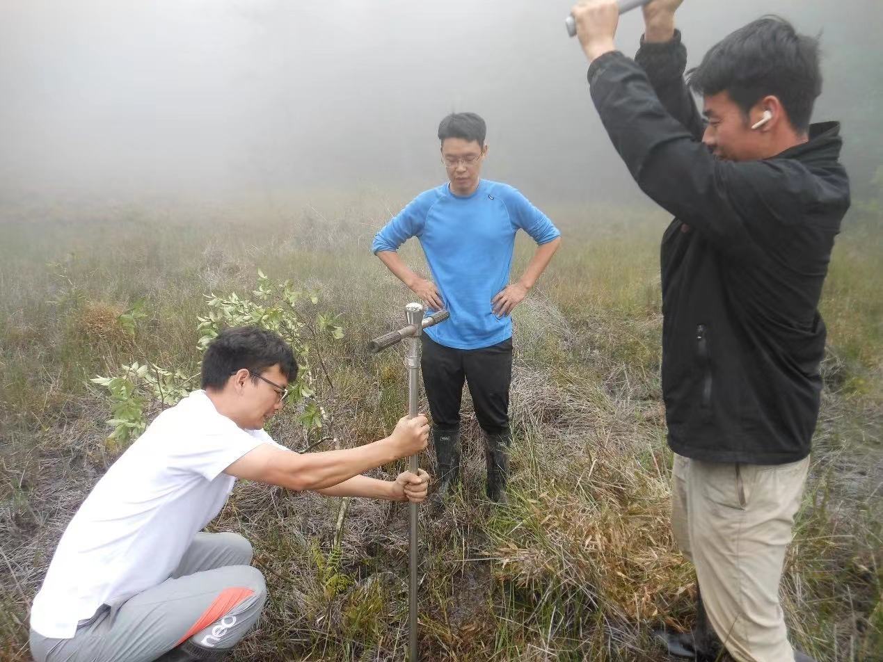 本研究始于2020年11月,當時研究團隊三位老師帶領地理科學專業學生在梅花山野外實習過程中意外收獲一鏟黑色泥炭,而泥炭是地學古環境研究理想的研究對象。2021年11月,潘大東老師組織師生團隊進一步對梅花山開展野外科研調查,繼續尋找更具科研價值的沼澤泥炭地。梅花山自然保護區山路崎嶇,考察條件艱苦,汽車難以到達,且無通訊信號,經過艱苦的探尋,團隊終于在第三天找到較為理想的泥炭地。