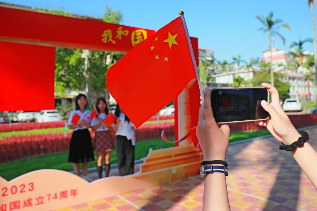 國慶節到來之際,閩南師范大學校園里各處紅旗招展,洋溢濃厚節日氛圍。閩南師大學子在校園里與國旗同框留影,用實際行動喜迎國慶。(董征 攝)