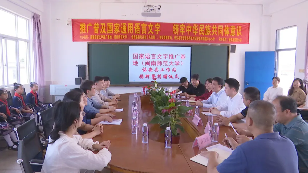 為進一步推廣普及國家通用語言文字,鑄牢中華民族共同體意識。3月26日上午,由漳州市詔安縣委統戰部(民宗局)、閩南師范大學文學院、國家語言文字推廣基地(閩南師范大學)主辦的國家語言文字推廣基地(閩南師范大學)詔安縣工作站揭牌暨捐贈儀式在美營小學舉行。