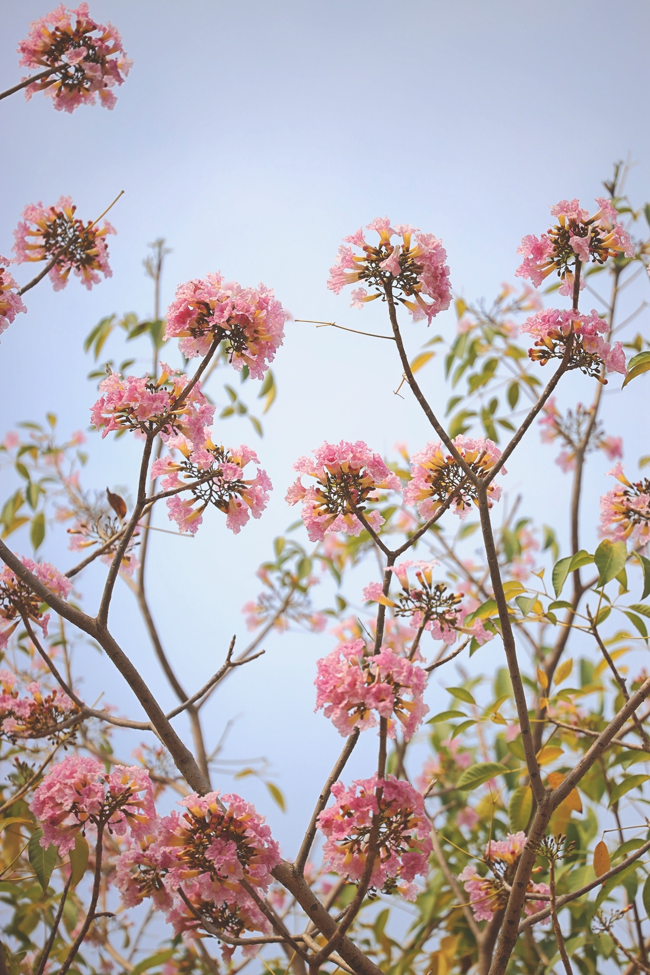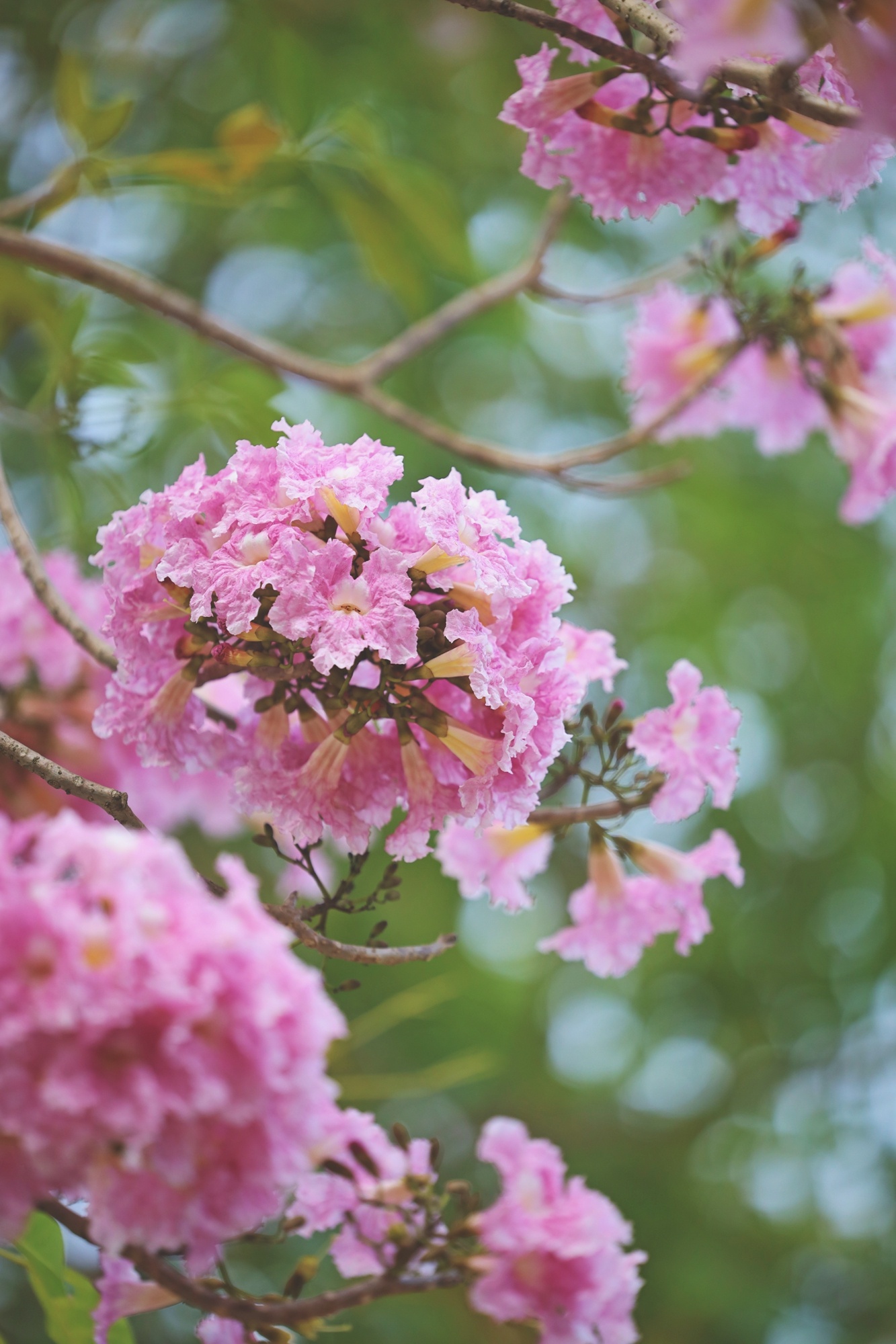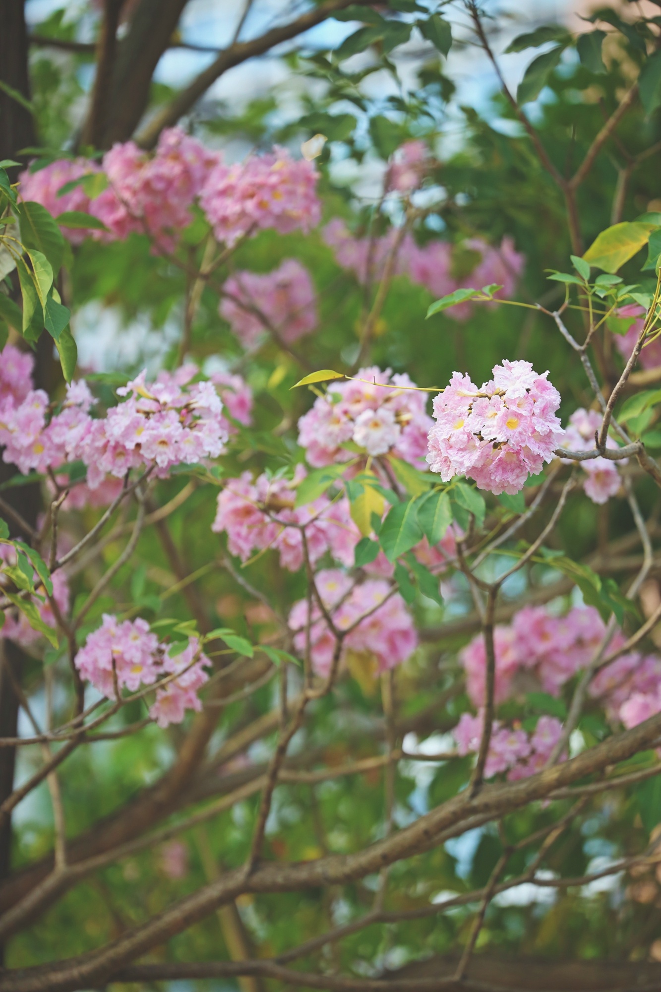 粉色的風(fēng)鈴木花團(tuán)錦簇,春風(fēng)吹拂,在枝頭搖曳。