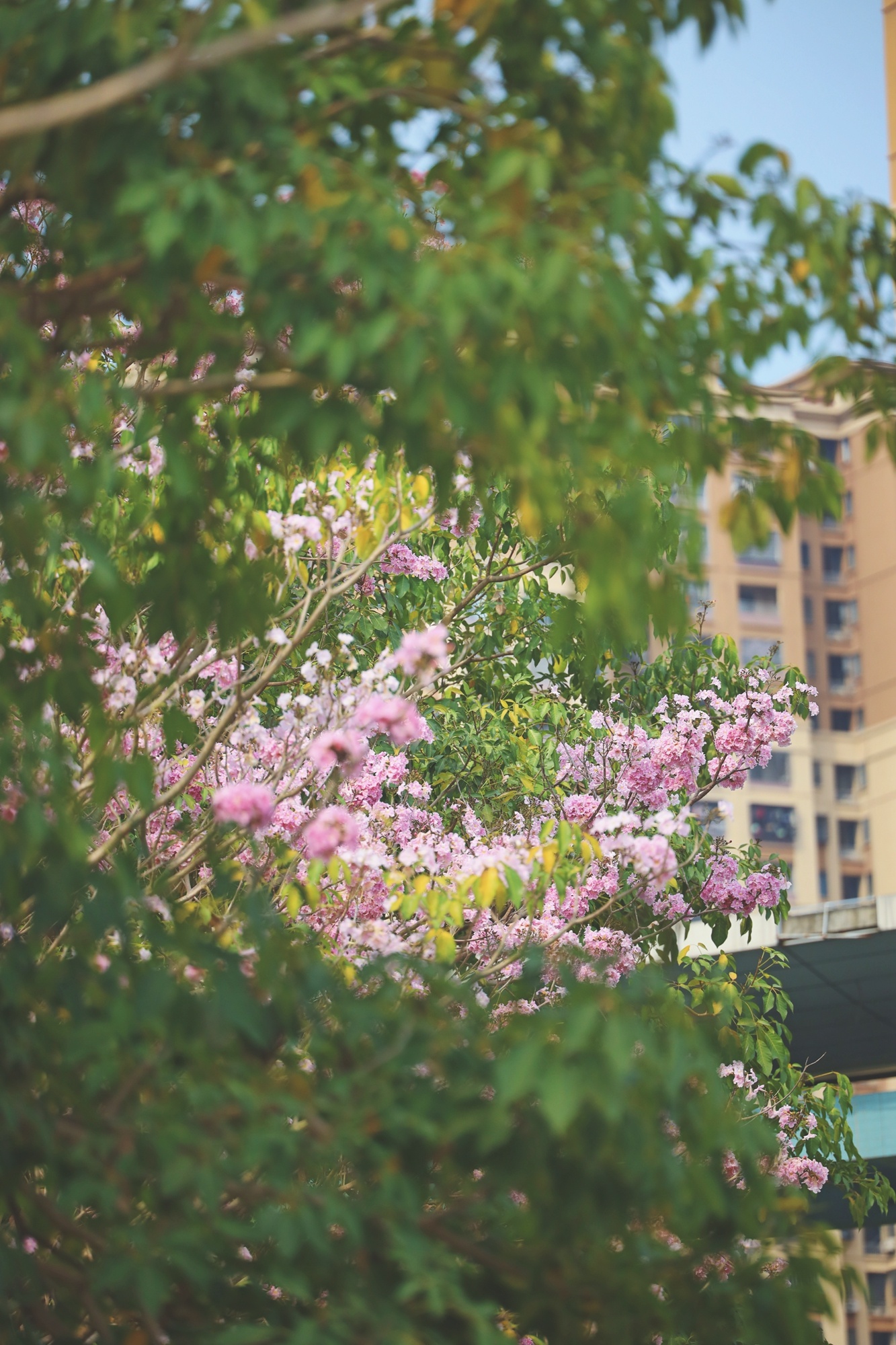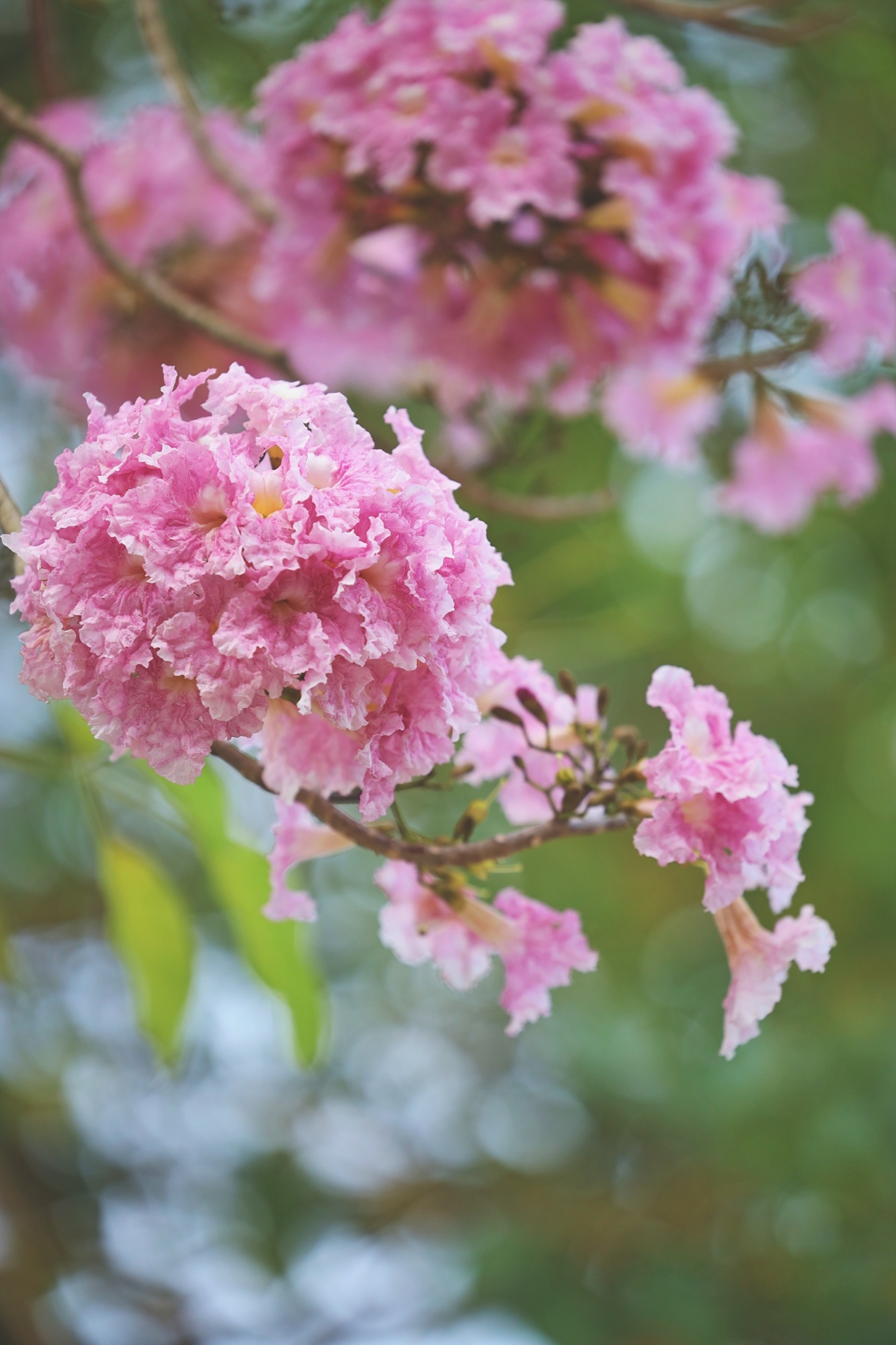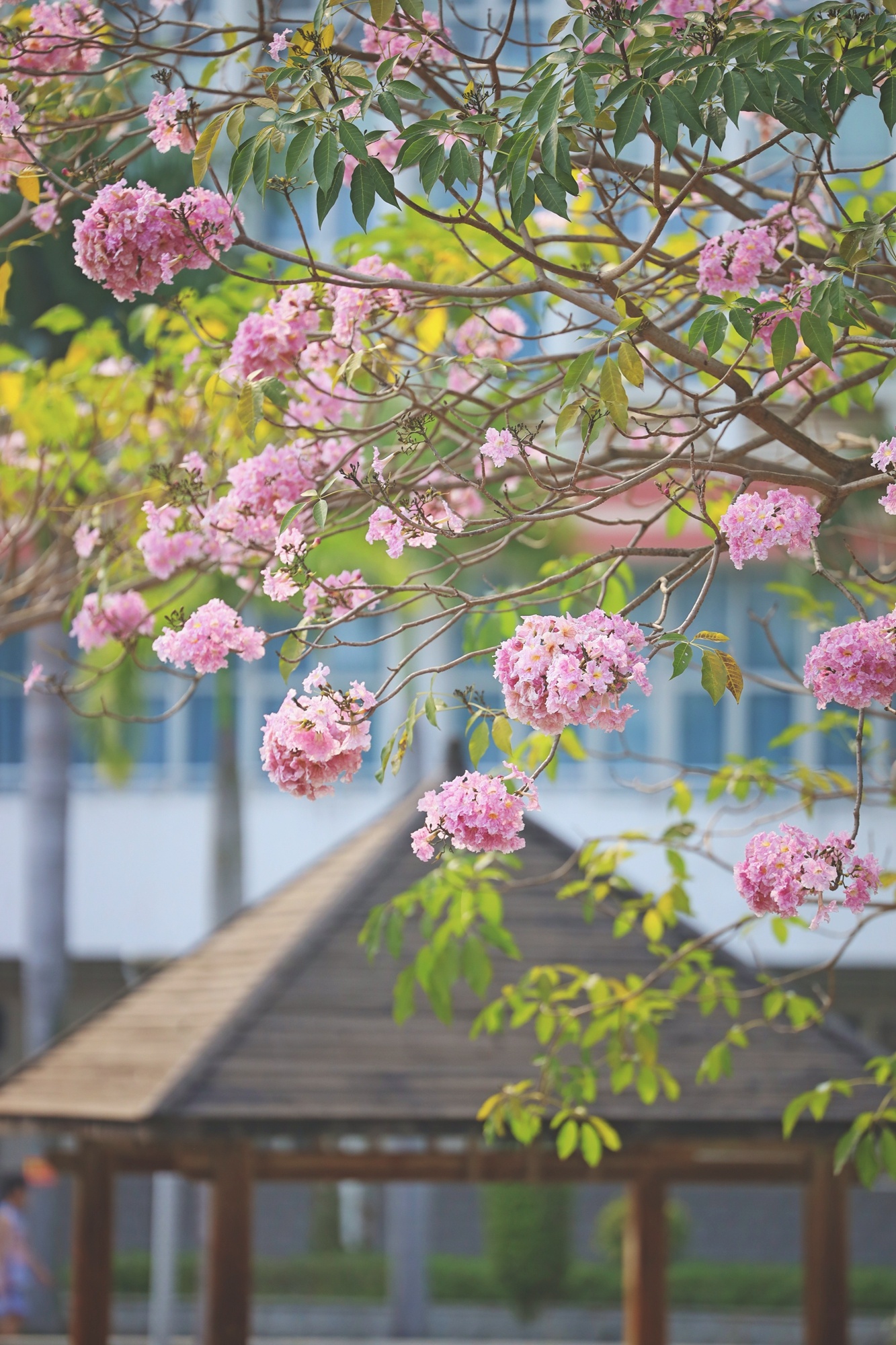 粉色的風(fēng)鈴木花團(tuán)錦簇,春風(fēng)吹拂,在枝頭搖曳。