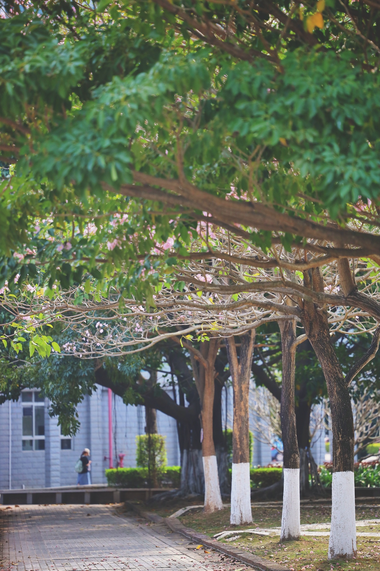 圖書館小徑旁的榕樹站成一列,枝葉延伸出一片綠蔭,為暖洋洋的春光帶來了一絲清涼。