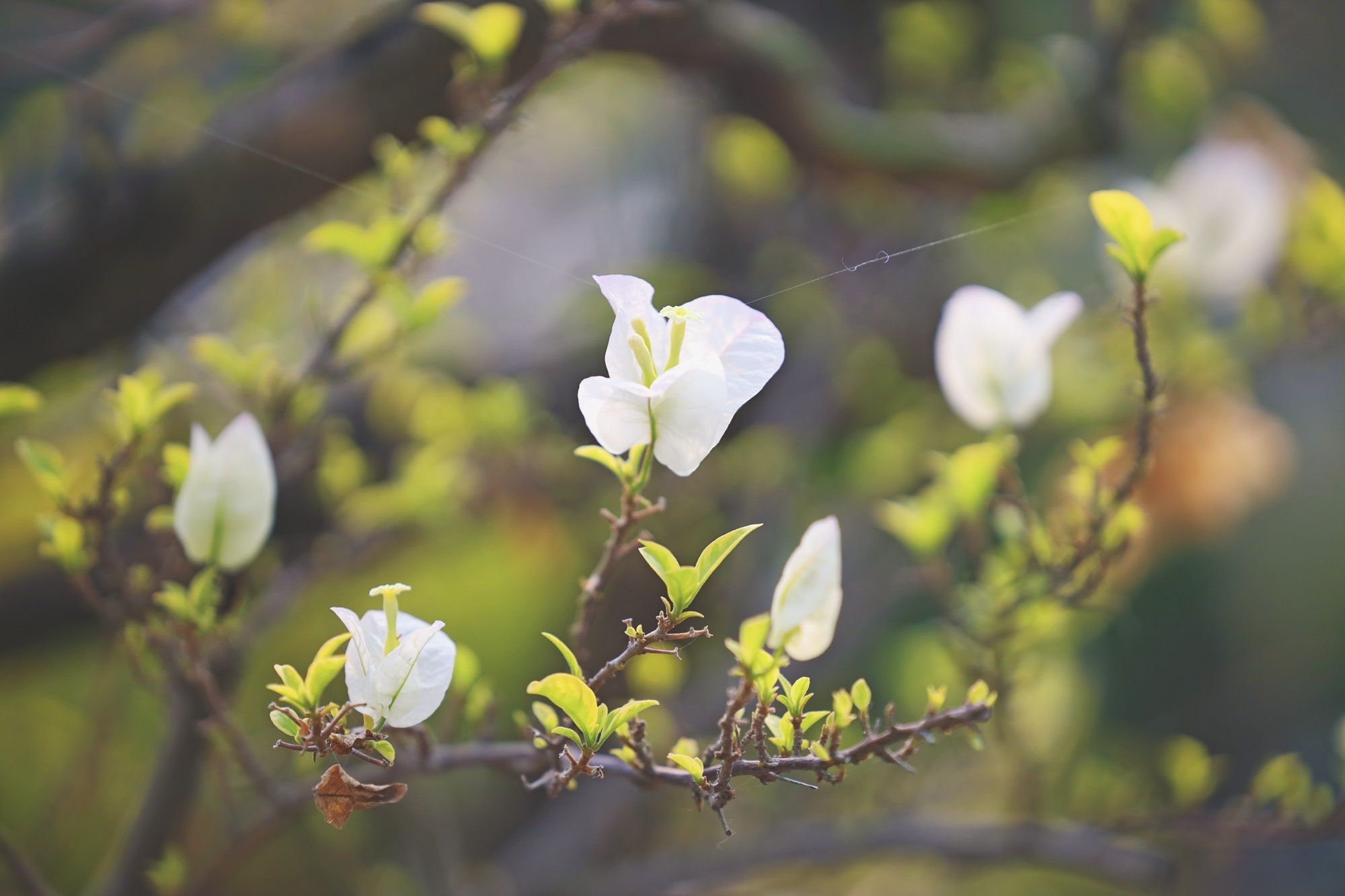 潔白的三角梅映襯著春日的陽光,在綠葉的簇?fù)硐聯(lián)u曳生姿。
