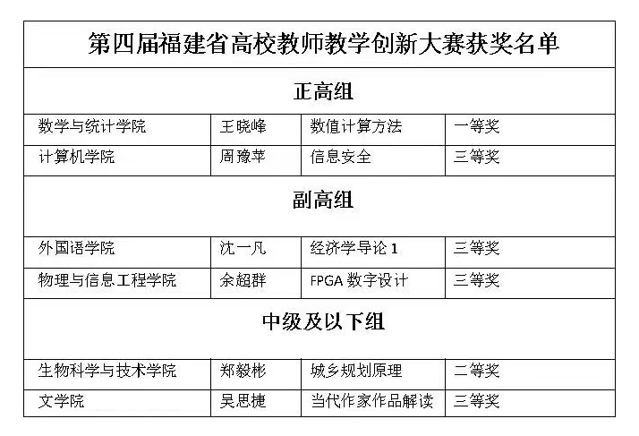 4月24日-26日,第四屆福建省高校教師教學(xué)創(chuàng)新大賽決賽在集美大學(xué)舉辦。我校教師(團(tuán)隊(duì))榮獲一等獎(jiǎng)一項(xiàng),二等獎(jiǎng)一項(xiàng),三等獎(jiǎng)四項(xiàng),實(shí)現(xiàn)了我校在省級(jí)教師教學(xué)創(chuàng)新大賽上獲獎(jiǎng)數(shù)量的突破。