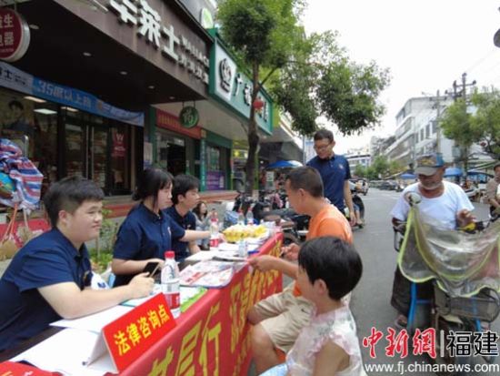 中新網福建新聞7月14日電(胡穎琪 劉素君 吳宇軒)“阿公阿媽,走過路過不要錯過,體驗一攬子服務,來贏一籃子雞蛋!”11日上午,在漳州市平和縣九峰鎮熱鬧的農貿市場里,來來往往的居民在一個特殊的攤點前駐足留步,這是閩南師范大學法學院“明法致知,普法篤行”暑期社會實踐團的法治服務攤點,實踐團的隊員們用濃厚的鄉音為廣大人民群眾送上了“一攬子”法治服務。