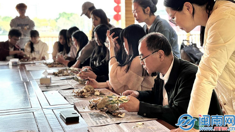 在南山書院,水仙花雕刻師陳建清為大家進行雕刻講解,雙方以“漳州非遺水仙花雕刻”為共同語言,開展了一場漳州文化的沉浸式互動體驗,中日師生的友誼也在“一水一花”中悄然交融,逐漸綻放。