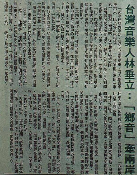 2007年6月,林垂立首次踏上大陸“尋根之旅”。一路上,他聽著鄉(xiāng)音,聽到了同樣的語言,聽到了他創(chuàng)作的歌曲《車站》、《春夏秋冬》等在海峽彼岸傳唱著。