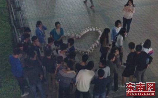 “大概9點40分左右,1號樓下就傳來幾個女生的喊樓聲。我是聽到動靜出來看熱鬧的。”12級物本班的張同學出來后看到樓下的空地上,女生們用小禮物擺成了一個桃心,七、八個女生喊著“12電信2班男生快下來!”
