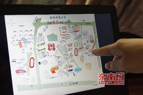 “先由學(xué)生手繪,然后掃描到電腦中,進(jìn)行PS繪圖。整張校園地圖包括了學(xué)校內(nèi)所有的標(biāo)志性地點(diǎn),讓新生們以最快的速度熟悉整個校園環(huán)境。”閩南師大學(xué)生處負(fù)責(zé)老師介紹,整版的手繪地圖均出自學(xué)姐學(xué)長們的手。整張地圖帶著濃濃的童心感,逗趣的繪畫也讓同學(xué)們對校園一目了然。