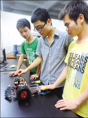 正是靠著通力合作的團隊精神,他們堅持到了最后。“在打磨亞克力板時,往往會惹得一身粉塵,但我們三人便輪流打磨,從不推諉。”莊培強說,整個過程團隊精神很重要,如果遇到有不同的意見時,他們就投票決定。而在這個過程中,他們的指導老師陳育群也在軟件編輯和車體設計上給予了不少建議。