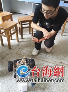 昨日中午,在物理與信息工程學院活動基地內,三名男生莊培強、羅力榕、施金才及他們的指導老師陳育群一起向導報記者演示了這個洗地機。