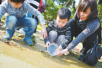 3月22日是“世界水日”,今年“中國水周”第一天。當日,閩南師大志愿者和漳州市民來到九龍江畔,放流上萬條濾食性魚類魚苗,以保護水環境。