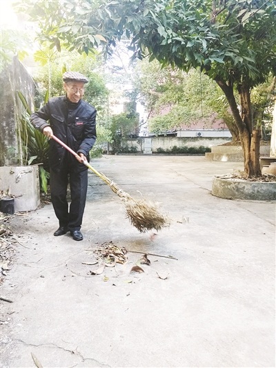 11年前,施克誠發現大院內有很多落葉,就拿起竹掃把掃起來,這一掃至今沒有停止過。他一天早晚各掃一次,時間早上6點-6點半和傍晚時分。每天清晨,他打掃完衛生,6點半才去閩南師大操場操練40分鐘4套太極拳。有時,落葉較多,勞動量大,他打掃到6點40分,就減少運動量,打30分鐘3套太極拳。“每天早起勞動,還能鍛煉身體,一舉兩得呀。”施克誠老人說。