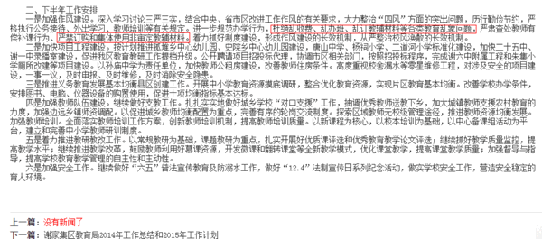 近日,《法制晚報》記者在謝家集區教育局官方網站上發現,該局在一份發布于2015年7月2日的工作總結中稱,“緊扣社會關注的亂補課、亂招生、亂辦班、亂訂教輔資料現象,開展了擇校亂收費和教輔材料管理自查、督查和教育收費檢查等活動。”