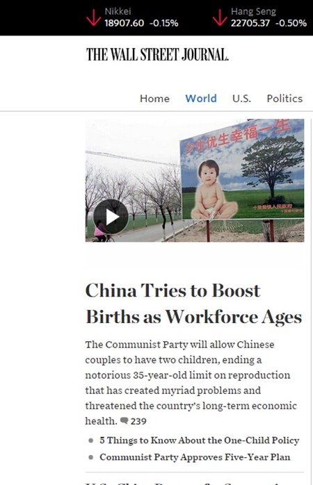 美國《華爾街日報》頭條為《中國嘗試提高生育率以應對勞動力老齡化》。《華爾街日報》認為此舉顯示出中國政府對于人口老齡化的擔心,但是政策制定者還沒有下決心完全放開計劃生育政策,也有聲音質疑放開二孩的時機顯得略晚。