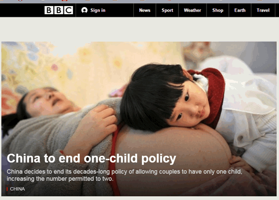 文中指出中國決定結束沿用數十年的每對夫婦只能生育一個小孩的政策,而是把這個數字增加到二。BBC認為該政策不會在短期內顯著改變中國人口老齡化的現狀。