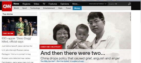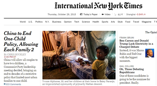美國《紐約時報》的頭條為《中國結束一孩政策,允許每個家庭生兩個》,文章回顧了中國實行計劃生育政策的歷程,認為放開二孩短期內不會改變人口比例。
