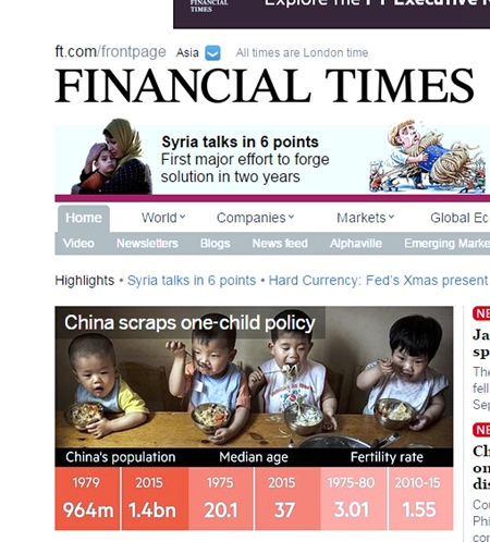英國《金融時報》的頭條也是《中國放棄一孩政策》。