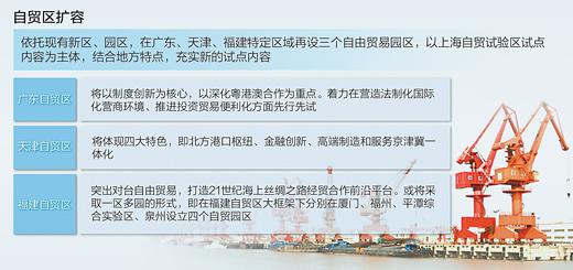 12月12日,廣東、天津、福建三地自貿區建設獲得“準生證”,自貿區擴容消息在國務院常務會議上得以確認:“依托現有新區、園區,在廣東、天津、福建特定區域再設三個自由貿易園區,以上海自貿試驗區試點內容為主體,結合地方特點,充實新的試點內容。”會議要求抓緊制定新設自貿園區具體方案,并提請全國人大常委會授權調整實施相關法律規定。