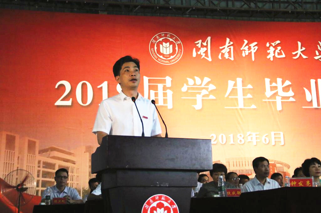 教師代表化學化工與環境學院陳建華教授在發言中向同學們表達了衷心的祝福,勉勵同學們心懷感恩,心存大愛,堅持理想,敬業擔當,努力成為有溫度、懂情趣、會思考的新時代新青年。教育科學學院陳孜穎同學代表全體畢業生發言,表達了對領導、老師的感恩之情,表示會銘記學校的殷切期盼和老師的深情囑托,不畏艱難、追求卓越、奮力拼搏。在校生代表商學院豐碩同學對學長學姐們表達了真摯的祝福,表示會承擔起建設新閩師的重任,攜手并進,早日成才。