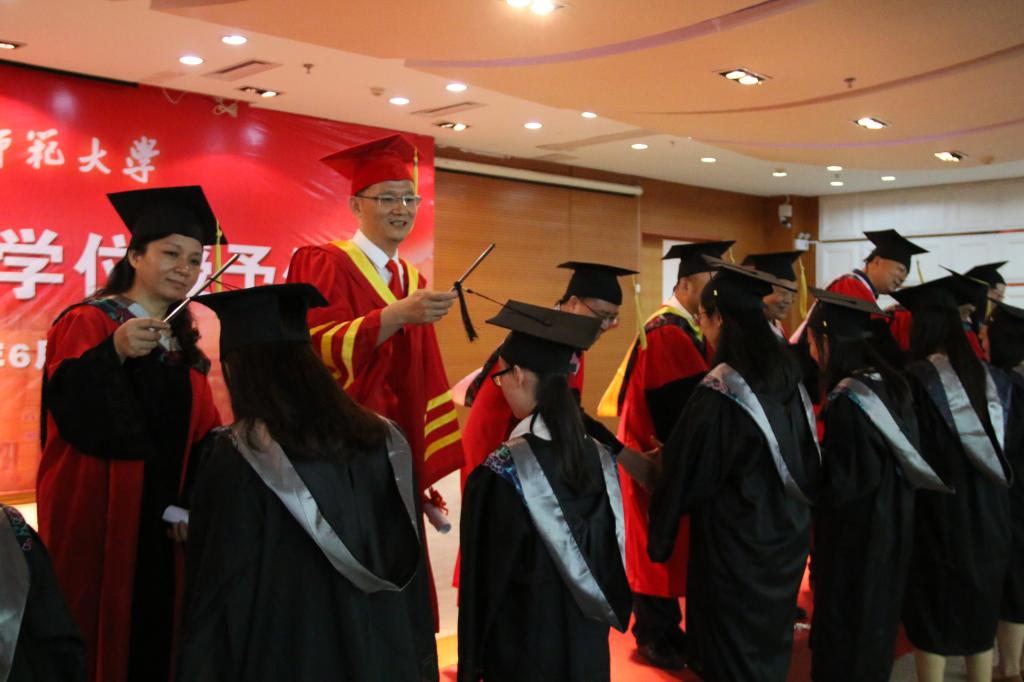 隨后,2018屆畢業生學位授予儀式在逸夫圖書館五樓舉行。在歡快的樂曲聲中,校長李順興帶領學校學位評定委員會18名老師為所有獲得碩士學位、學士學位的畢業生撥正流蘇,頒發學位證書,并與畢業生合影留念,向即將踏上新征程的畢業生表達美好祝愿。