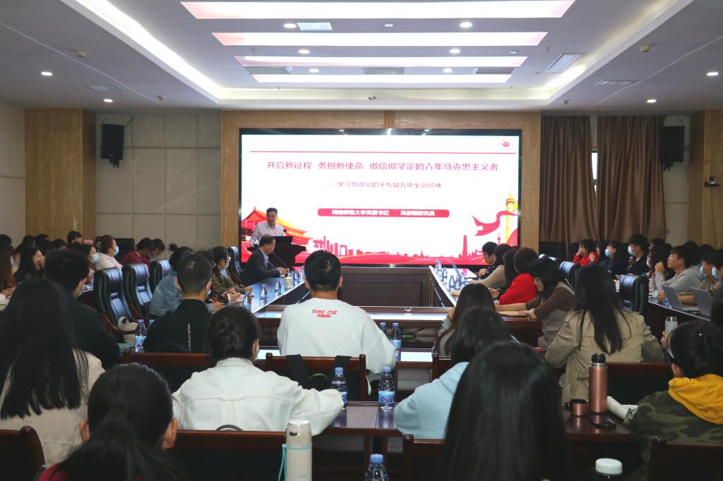 12月24日,我校在科技樓舉行黨的十九屆五中全會精神宣講報告會。校黨委書記吳彬鏹作題為《開啟新征程 勇擔新使命 做信仰堅定的青年馬克思主義者——學習貫徹黨的十九屆五中全會精神》的宣講報告。馬克思主義學院思政課教師、輔導員、研究生代表、本科生代表共100多人聆聽了報告。
