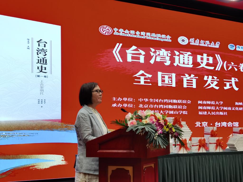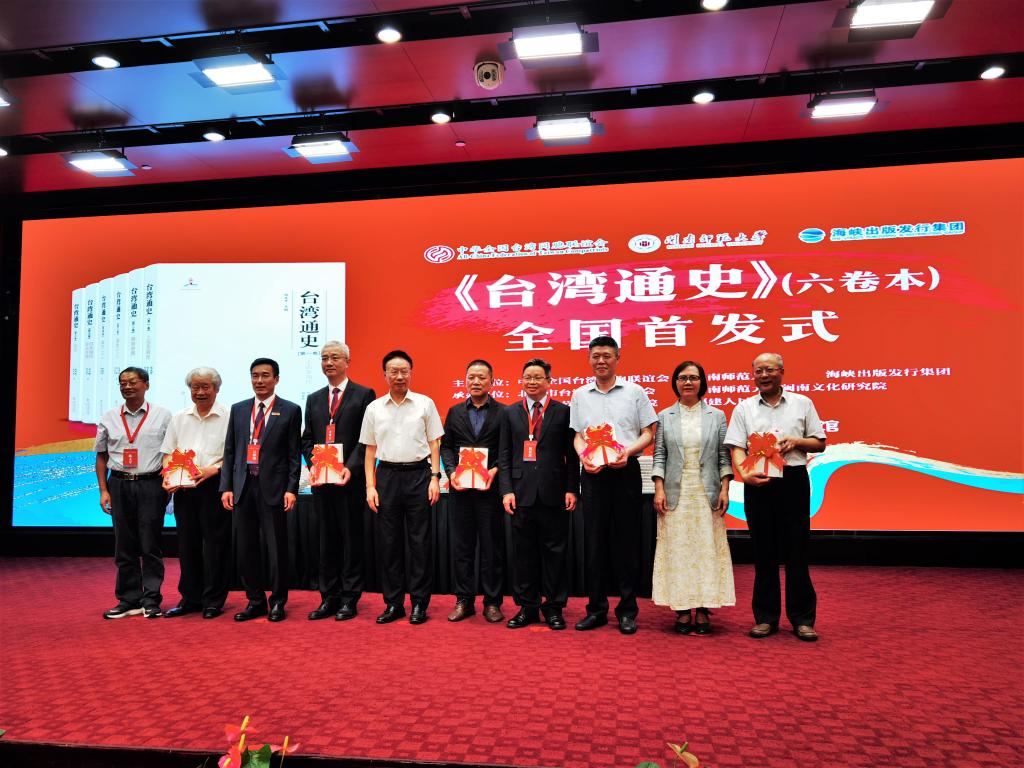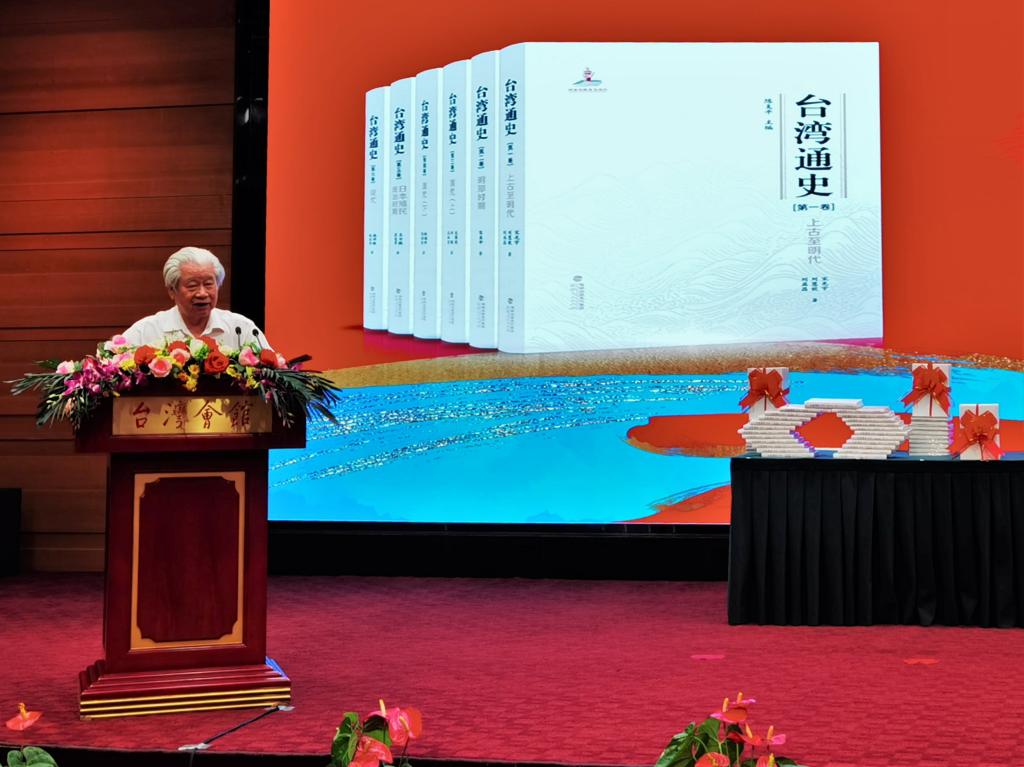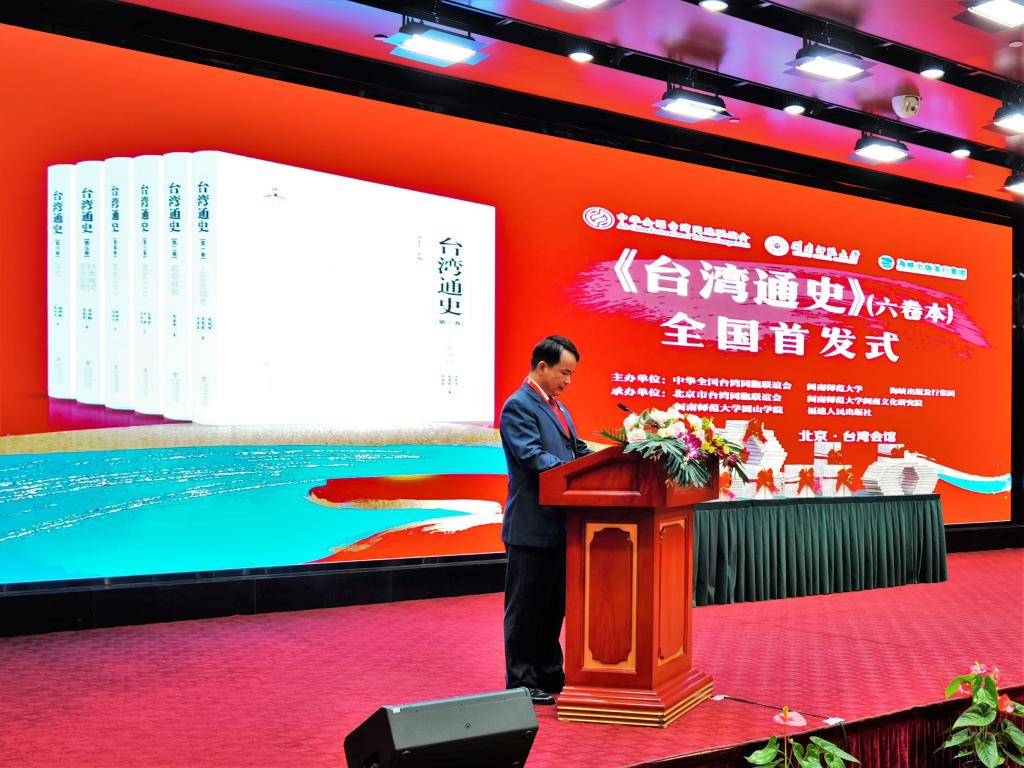 7月17日,由中華全國(guó)臺(tái)灣同胞聯(lián)誼會(huì)、閩南師范大學(xué)、海峽出版發(fā)行集團(tuán)主辦,北京市臺(tái)灣同胞聯(lián)誼會(huì)、閩南師范大學(xué)閩南文化研究院、閩南師范大學(xué)圓山學(xué)院、福建人民出版社共同承辦的《臺(tái)灣通史》(六卷本)全國(guó)首發(fā)式在北京臺(tái)灣會(huì)館舉行。國(guó)臺(tái)辦、教育部、文化和旅游部、民革中央、臺(tái)盟中央、海峽兩岸關(guān)系協(xié)會(huì)、中國(guó)社會(huì)科學(xué)院、全國(guó)臺(tái)灣研究會(huì)、北京大學(xué)、清華大學(xué)、中國(guó)人民大學(xué)、北京工商大學(xué)、北京聯(lián)合大學(xué)、中國(guó)藝術(shù)研究院、中國(guó)明史學(xué)會(huì)等單位領(lǐng)導(dǎo)、專家學(xué)者,人民日?qǐng)?bào)、新華社、光明日?qǐng)?bào)、中央廣播電視總臺(tái)等20多家新聞媒體,海峽出版發(fā)行集團(tuán),閩南師范大學(xué)北京校友代表以及閩南師范大學(xué)有關(guān)部門領(lǐng)導(dǎo)和教師代表共100人參加首發(fā)式。首發(fā)式由閩南師范大學(xué)黨委常委、副校長(zhǎng)張龍海主持。
