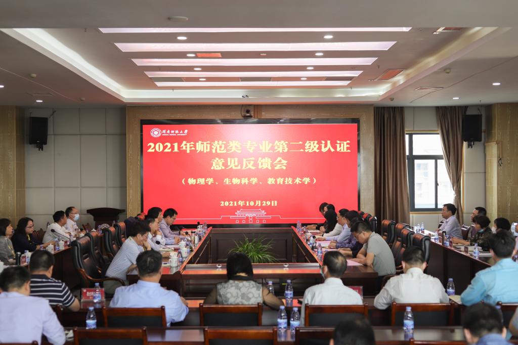 李順興代表學校作表態發言。他指出,專家們既充分肯定了物理學、生物科學、教育技術學三個師范專業的認證達成情況,又精準指出了存在的問題與不足,提出了有科學性、針對性和指導性的建議,對提高我校師范專業建設水平和教師教育人才培養質量具有十分重要的意義。學校將嚴格對照認證標準,制定整改方案,以堅決的態度、有力的舉措,立行立改、真改實改、全面整改,不斷做強專業辦學特色,培養更多的高素質教師人才,為辦好人民滿意的教育作出更大貢獻。