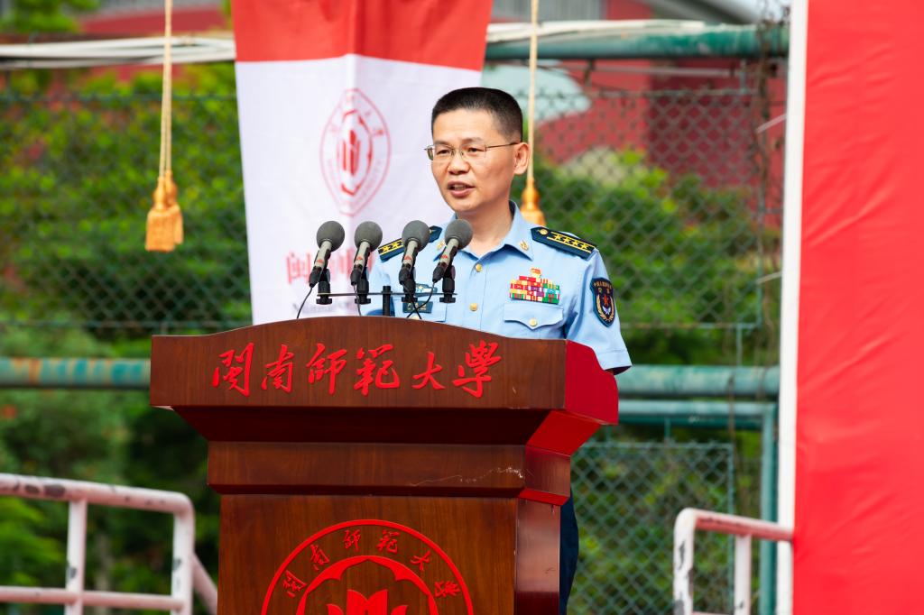 校黨委書記吳彬鏹向閩南師范大學軍訓團、閩南師范大學圓山營教官代表授旗