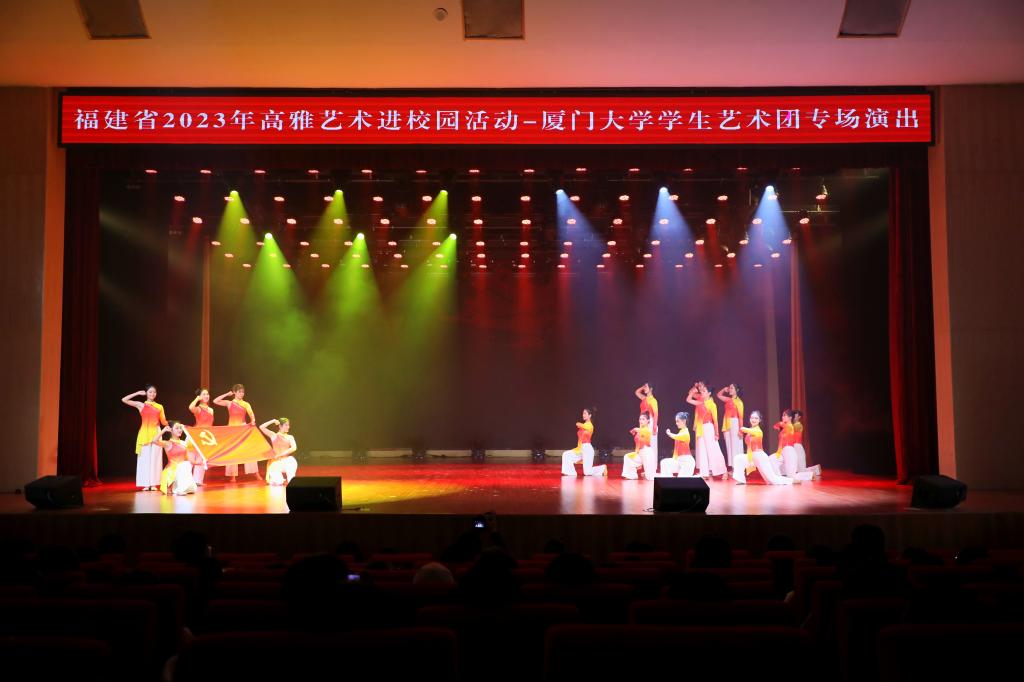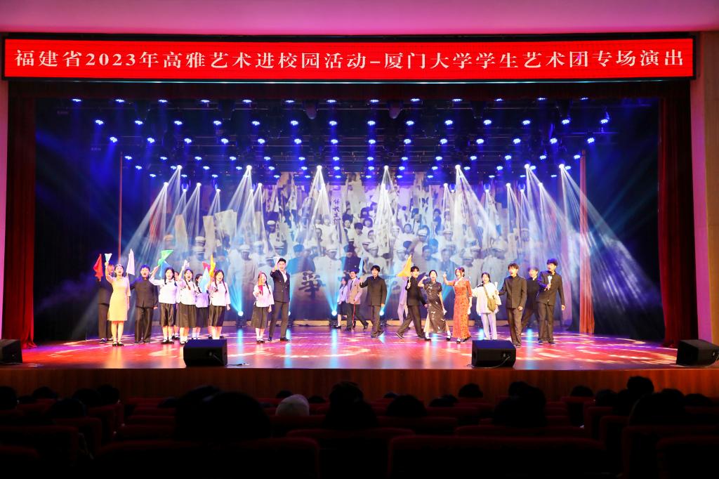 據悉,高雅藝術進校園活動是教育部、文化部、財政部開展的一項普及高雅藝術的活動,將高雅藝術融入校園文化建設中,豐富高校校園文化生活。此次展演的《南強頌》是由廈門大學師生自編自導自演的一場歷史文化晚會,近兩百名學生演員參與演出,為現場觀眾展示了廈門大學辦學治校的輝煌歷史和學校深厚的文化底蘊。