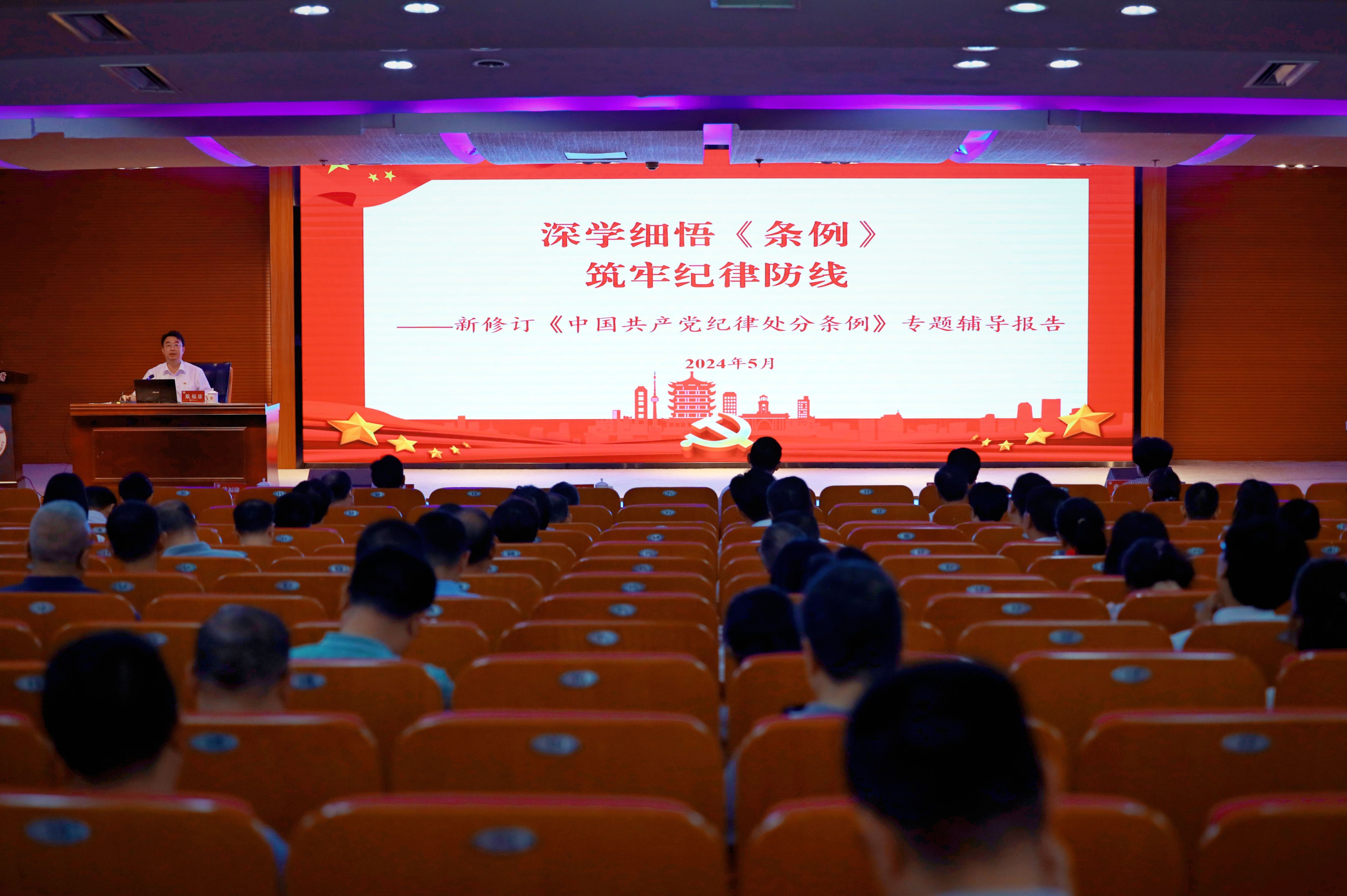 隨后,校紀委書記、黨紀學習教育工作專班副主任戴福康對開展群眾身邊不正之風和腐敗問題集中整治工作進行傳達部署,并以《深學細悟<條例> 筑牢紀律防線》為題作專題輔導報告。他從《條例》的歷史沿革、新修訂《條例》的主要內容以及抓好貫徹執行等三個方面對《條例》進行深入解讀,并結合翔實案例,帶領大家深刻領悟《條例》的精神實質和主旨要義。他指出,學習貫徹新修訂《條例》是當前一項重要政治任務,要堅持分類指導,突出“關鍵少數”,聚焦年輕干部和學生黨員,盯緊重點領域,把“要我學”變為“我要學”。要注重案例挖掘,找準典型案例,創新教育載體,形成長效機制,用“身邊事”教育“身邊人”。要強化知行合一,既“懂紀律”又“守紀律”,努力在以學鑄魂、以學正身、以學促為方面取得實效,做學習貫徹《條例》的實踐者、推動者和監督者。