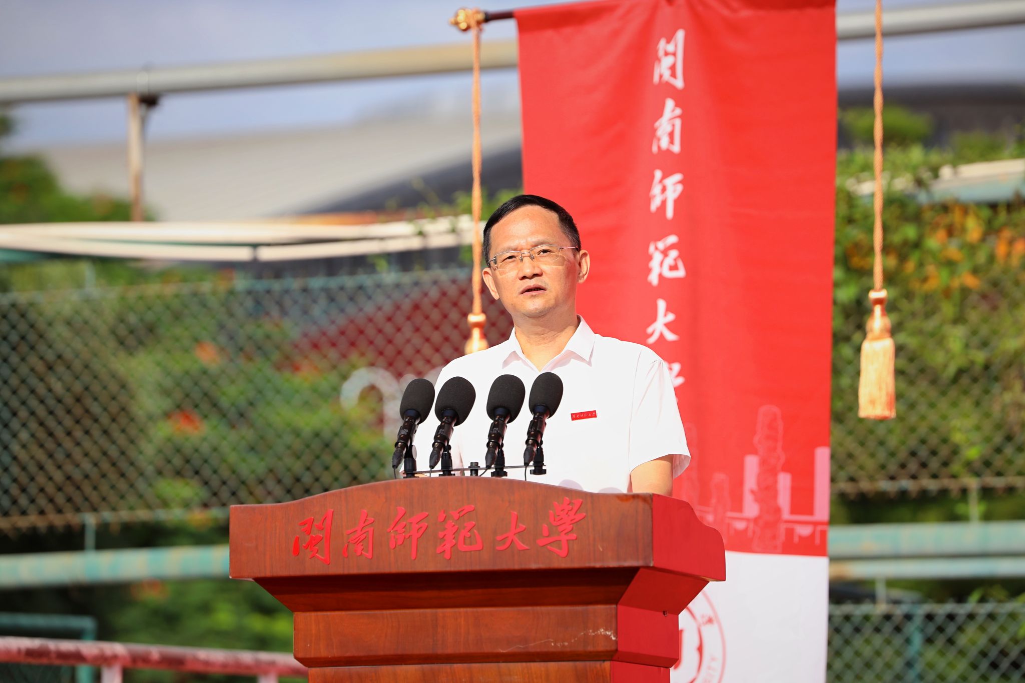 在圓山校區(qū),林致遠(yuǎn)回顧了圓山校區(qū)的辦學(xué)歷程和歷史底蘊(yùn),并以閩南師范大學(xué)校訓(xùn)與新同學(xué)共勉,希望同學(xué)們要拓展博學(xué)的治學(xué)視野,廣泛涉獵知識(shí),關(guān)注學(xué)科的交叉融合,掌握高效的學(xué)習(xí)方法贏得發(fā)展的主動(dòng)。要形成明理的人生格局,胸懷祖國,明辨是非,將聰明才智奉獻(xiàn)給社會(huì)和祖國的美好未來。要樹立礪志的學(xué)習(xí)態(tài)度,立大志、修大德、成大事,在自立自強(qiáng)的信念中凝聚勇氣和力量。要培養(yǎng)篤行的意志毅力,發(fā)揚(yáng)面壁十年圖破壁的破繭精神,知行合一,厚積薄發(fā),努力實(shí)現(xiàn)人生的蛻變和升華。