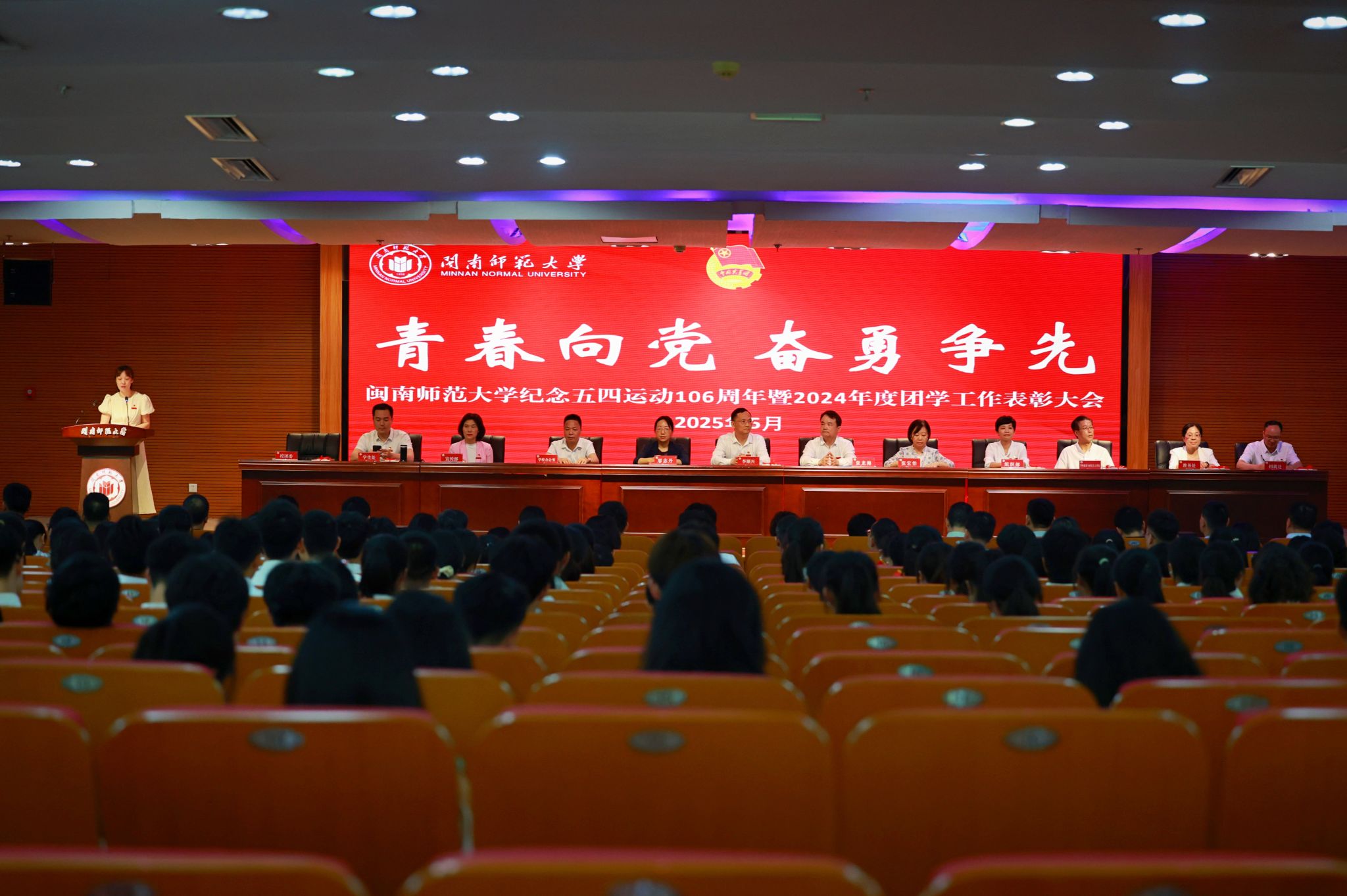 5月8日下午,我校在逸夫圖書館五樓報告廳舉行“青春向黨 奮勇爭先”閩南師范大學紀念五四運動106周年暨2024年度團學工作表彰大會。校領導李順興、張龍海、廖志丹、張宏怡出席。大會在雄壯的國歌聲中拉開序幕。