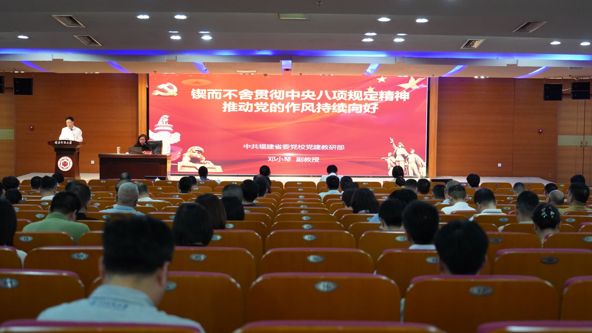 5月14日下午,校黨委在逸夫圖書館五樓報告廳舉行深入貫徹中央八項規定精神學習教育專題輔導報告會。福建省委黨校黨建教研部鄧小琴副教授應邀作《鍥而不舍貫徹中央八項規定精神 推動黨的作風持續向好》專題輔導報告。校黨委副書記、黨委學習教育工作專班副主任林致遠主持會議。