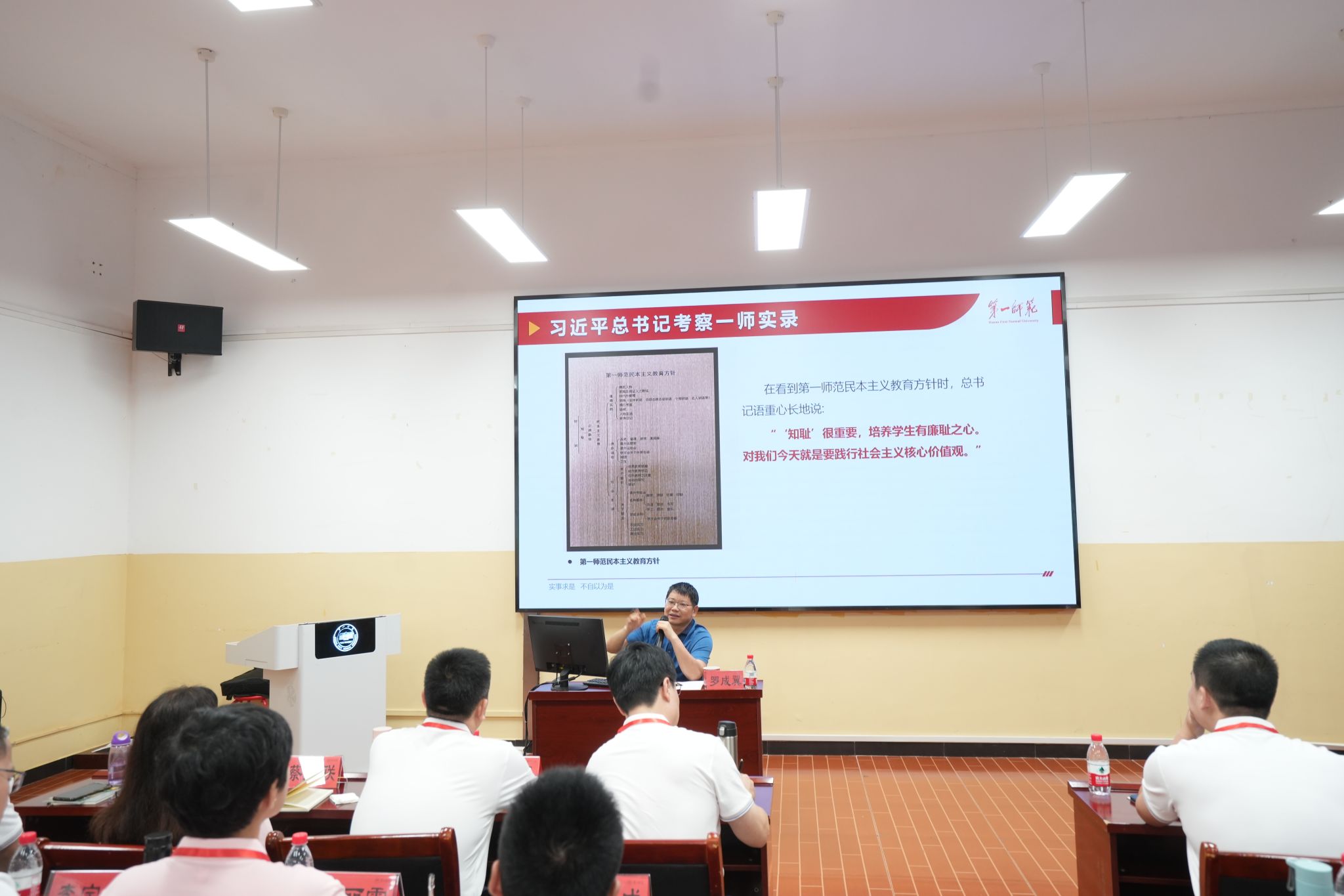 羅成翼代表湖南第一師范學院對我校黨員干部的到來表示歡迎,并介紹了學校的發展歷程、辦學特色和未來發展規劃。他表示,兩所學校同屬師范院校,同在教育部“師范教育協同提質計劃”第八組團,希望以此次培訓交流為契機,進一步深化合作,推動共同發展。隨后,羅成翼以《牢記總書記囑托 貫徹落實立德樹人根本任務(學習黨的二十屆三中全會精神)》為題為學員作輔導報告。