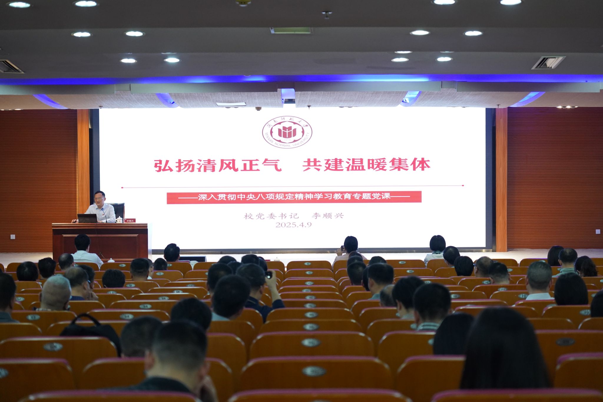 開班式后,李順興以《弘揚(yáng)清風(fēng)正氣 共建溫暖集體》為題講授專題黨課。他結(jié)合各類典型案例,生動(dòng)闡釋了開展深入貫徹中央八項(xiàng)規(guī)定精神學(xué)習(xí)教育在鞏固執(zhí)政根基、增強(qiáng)黨員政治自覺等層面的重要意義,剖析了當(dāng)前高校落實(shí)中央八項(xiàng)規(guī)定精神的突出問題。他強(qiáng)調(diào),要構(gòu)建學(xué)習(xí)教育和作風(fēng)建設(shè)的責(zé)任體系,深化審巡紀(jì)財(cái)聯(lián)動(dòng)監(jiān)督,聚焦科研經(jīng)費(fèi)、基建采購(gòu)等重點(diǎn)領(lǐng)域開展專項(xiàng)整治,堅(jiān)決“由風(fēng)查腐”“由腐糾風(fēng)”。要以學(xué)習(xí)教育推動(dòng)管理體制改革,建立黨員干部“三省吾身”長(zhǎng)效機(jī)制,強(qiáng)化依法治校與目標(biāo)管理,優(yōu)化資金、人才等資源配置。要堅(jiān)持問題導(dǎo)向,把扎實(shí)開展學(xué)習(xí)教育同推動(dòng)干事創(chuàng)業(yè)、改進(jìn)作風(fēng)、服務(wù)師生密切結(jié)合起來,細(xì)化“創(chuàng)先爭(zhēng)優(yōu)年”任務(wù)清單,將學(xué)習(xí)教育成效轉(zhuǎn)化為辦學(xué)發(fā)展成效。他要求,各級(jí)黨組織要堅(jiān)持政治引領(lǐng),協(xié)力共建溫暖集體,扎實(shí)推動(dòng)作風(fēng)建設(shè),通過增強(qiáng)服務(wù)意識(shí)、建設(shè)廉潔校園、推進(jìn)團(tuán)結(jié)互助,營(yíng)造創(chuàng)先爭(zhēng)優(yōu)的濃厚氛圍,為建設(shè)教育強(qiáng)國(guó)貢獻(xiàn)閩南師大力量。